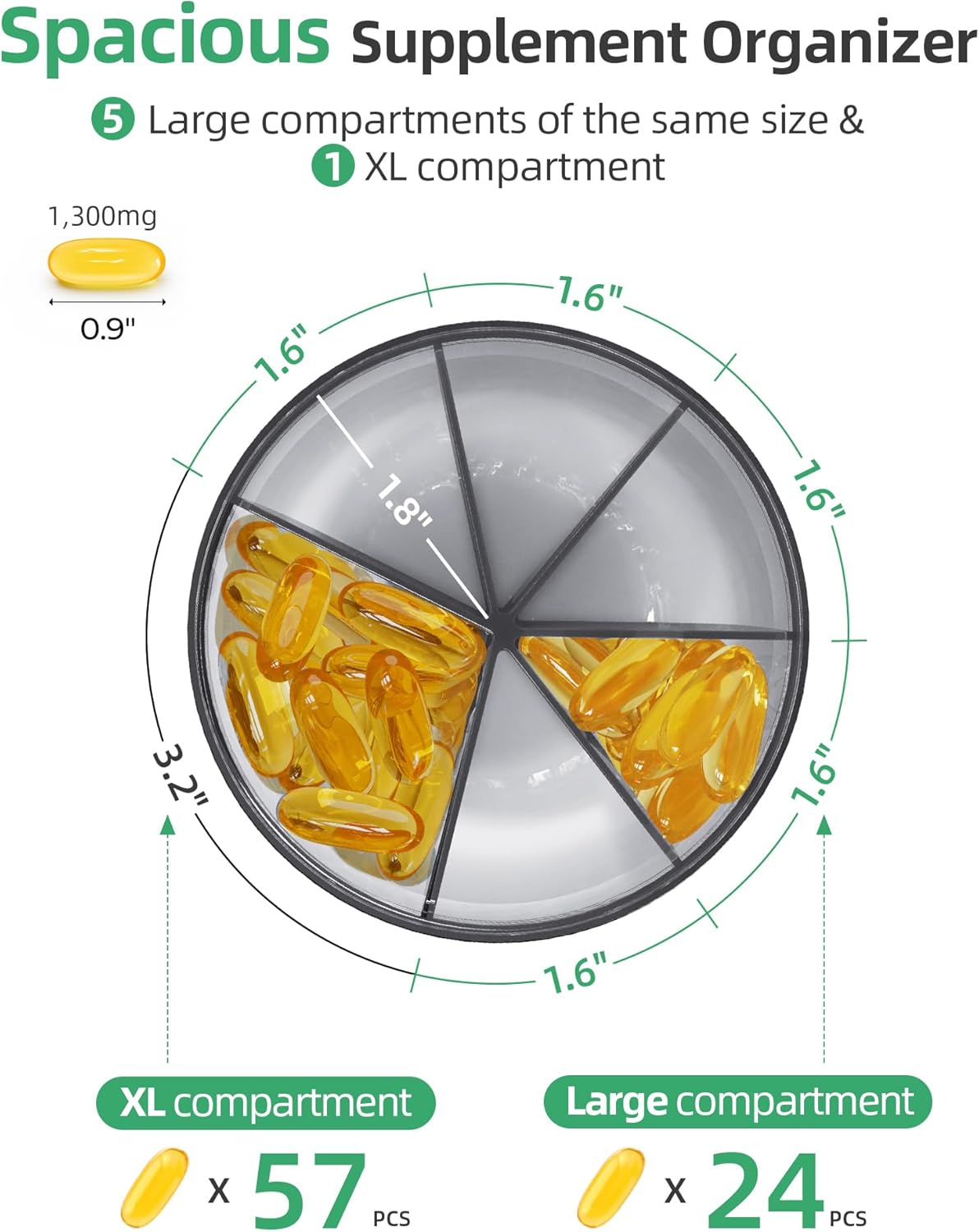 Spacious Design: The XL compartment can hold up to 57 softgels (1300mg), while the standard compartments hold 24 each—ample for extended use.
